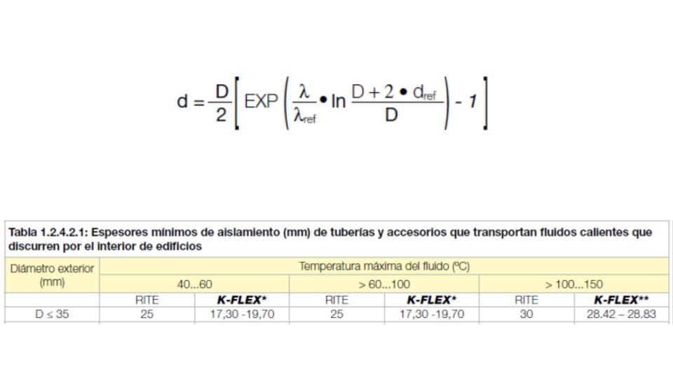 El RITE, para determinar estos espesores según las características de la instalación, considera un coeficiente de conductividad térmica de 0,040W/m*K a 10ºC y aclara que, cuando se utilice un material aislante cuyo coeficiente de conductividad térmica sea diferente al establecido como patrón, se deberá aplicar la fórmula que el mismo RITE determina para calcular el espesor equivalente del aislamiento.