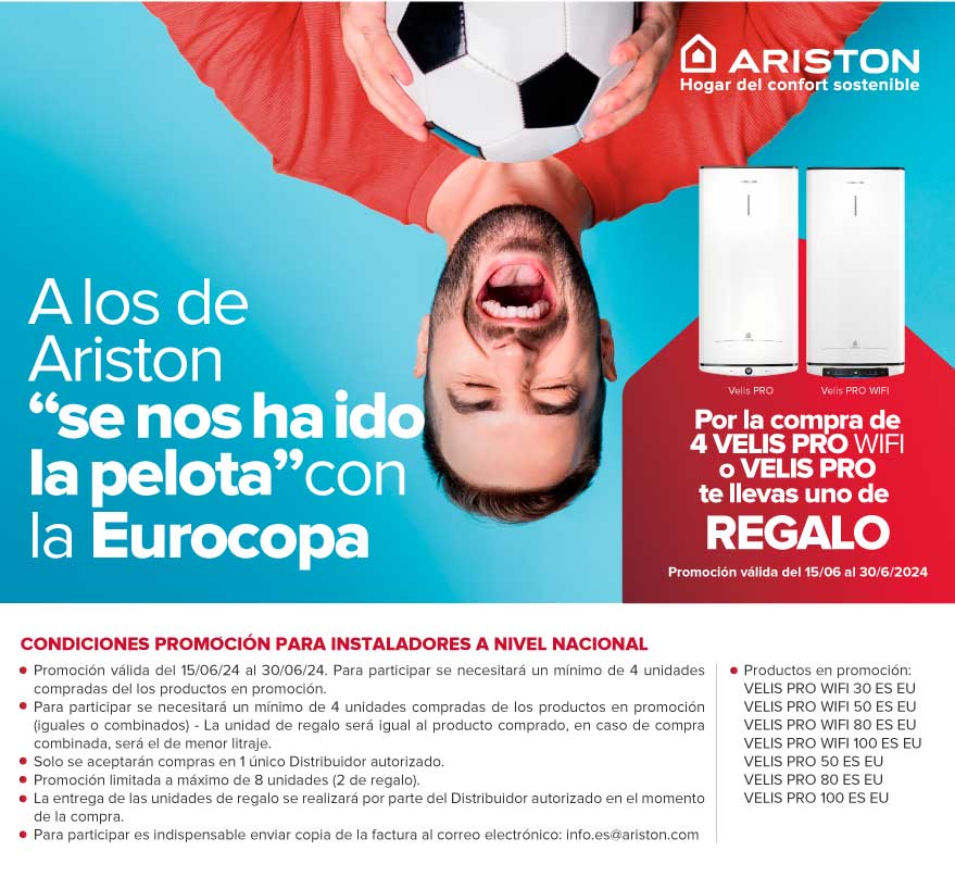 Con el eslogan «A los de Ariston se nos ha ido la pelota con la Eurocopa», Ariston ofrece un modelo gratuito por la compra de 4 termos Velis Pro o Velis Pro WiFi, ayudándote a equipar tu negocio con productos de alta calidad. La promoción es válida del 15 al 30 de junio de 2024 e incluye los siguientes modelos: