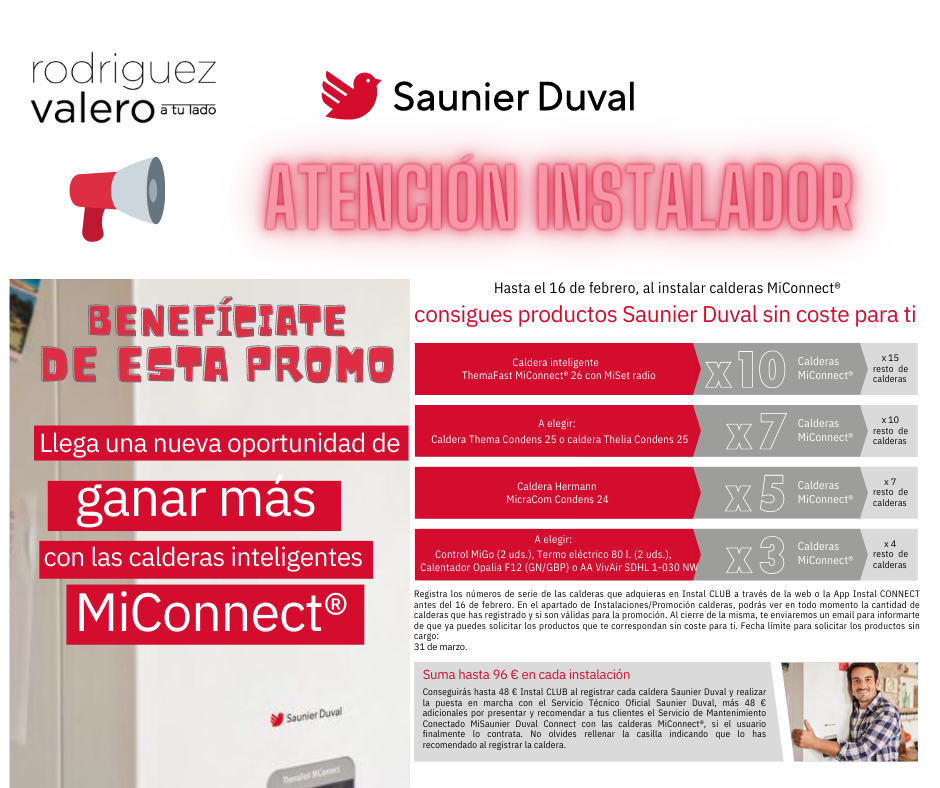 Durante el periodo comprendido entre el 16 de enero y el 16 de febrero, los instaladores que compren calderas Vaillant o Saunier tendrán la oportunidad de obtener productos gratuitos de estas marcas dependiendo de la cantidad de calderas adquiridas.