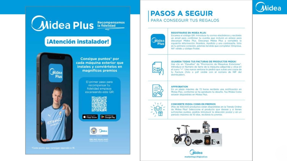 Es muy sencillo: por cada máquina exterior Midea que instales, recibirás Midea Coins (1 punto = 1 €).