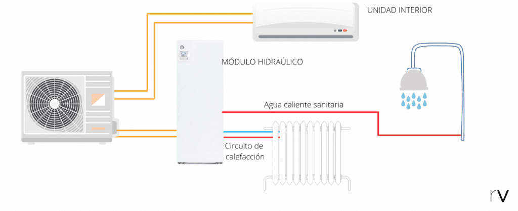 Los equipos de aerotermia híbrida son capaces de dar servicio de aire acondicionado mediante expansión directa (gas refrigerante) y producción de calor/frío por agua para dar servicio a sistemas de calefacción suelo radiante o radiadores de baja temperatura y al mismo tiempo producir agua caliente sanitaria (ACS).